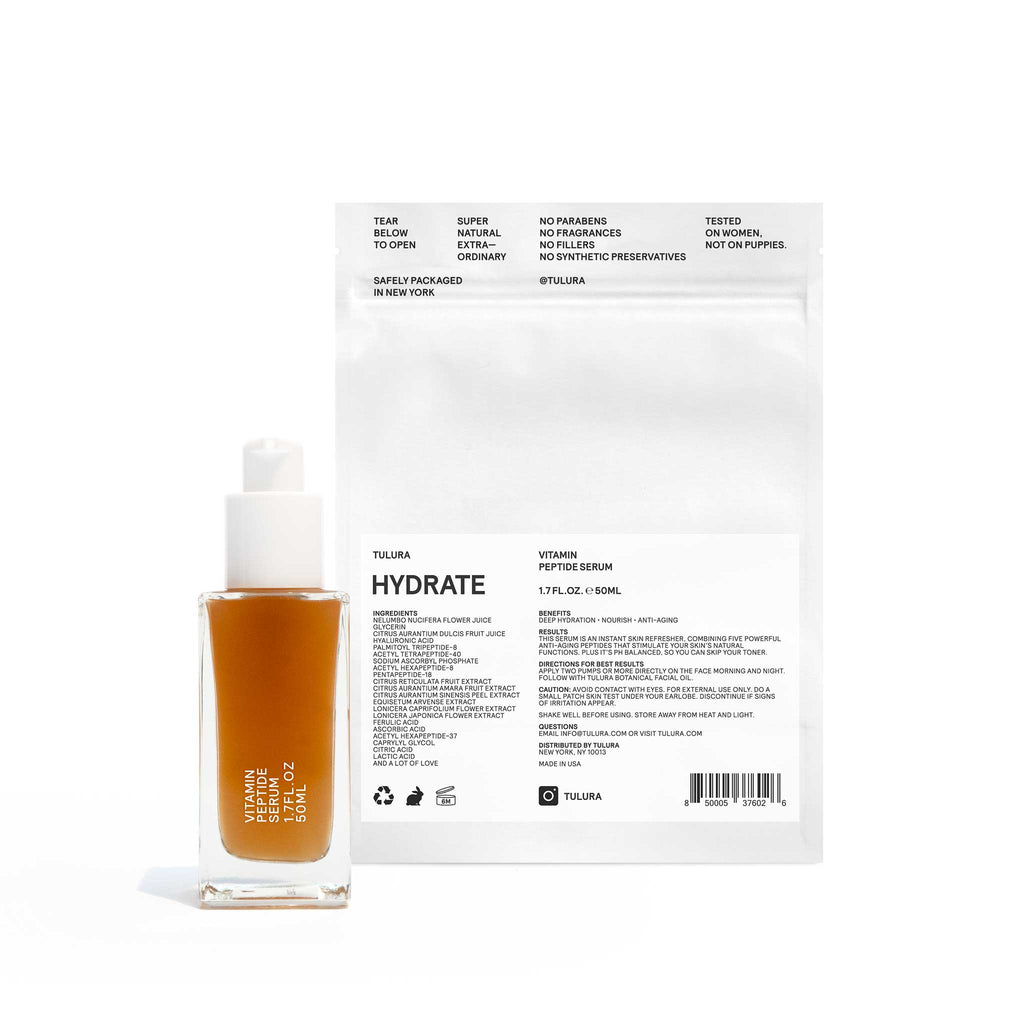 Vitamin Peptide Serum: This serum is an instant skin refresher, combining five powerful anti-aging peptides that stimulate your skin’s natural functions. Plus it’s pH balanced, so you can skip your toner.
